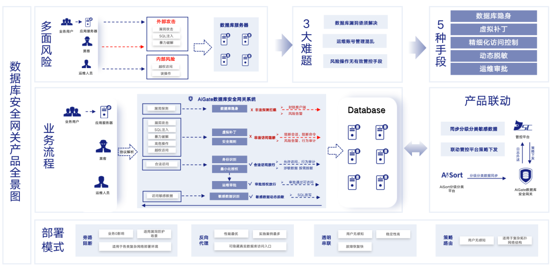 為了解決以上數(shù)據(jù)庫安全建設(shè)面臨的挑戰(zhàn),安恒信息為該醫(yī)院客戶推薦了安恒AiGate數(shù)據(jù)庫安全網(wǎng)關(guān)系統(tǒng)(以下簡(jiǎn)稱AiGate)。AiGate是安恒信息在多年數(shù)據(jù)安全訪問控制理論和實(shí)踐經(jīng)驗(yàn)積累的基礎(chǔ)上,集數(shù)據(jù)庫準(zhǔn)入、訪問控制、攻擊防護(hù)、動(dòng)態(tài)脫敏、 運(yùn)維審批等多種功能一體的產(chǎn)品。目前,該產(chǎn)品已在多個(gè)行業(yè)被廣泛應(yīng)用,保障著用戶的重要數(shù)據(jù)和敏感信息。