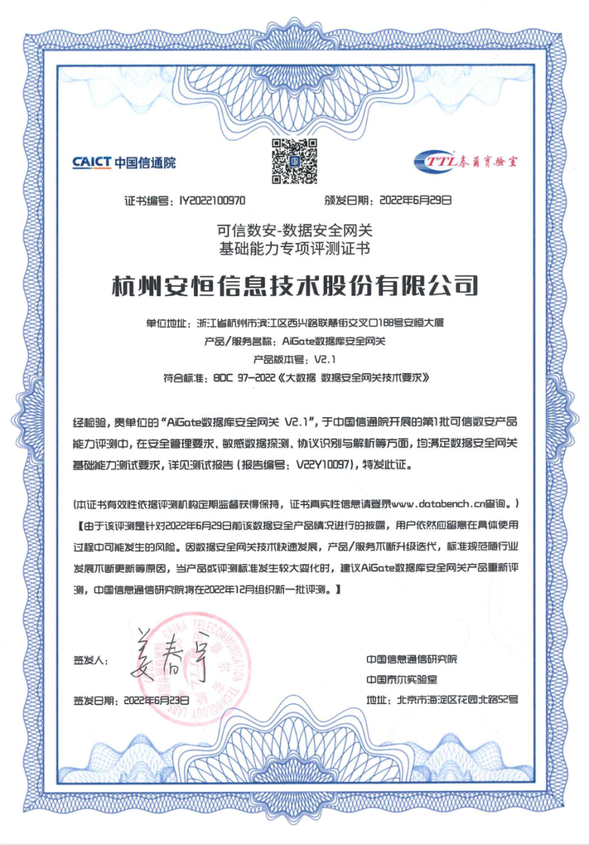 安恒AiGate數(shù)據(jù)庫安全網(wǎng)關(guān)之所以能得到客戶的廣泛認(rèn)可,離不開安恒信息多年數(shù)據(jù)庫安全訪問控制理論和實(shí)踐經(jīng)驗(yàn)積累。AiGate集成了安恒信息市場(chǎng)領(lǐng)先的數(shù)據(jù)庫協(xié)議解析技術(shù),并在多年現(xiàn)場(chǎng)實(shí)戰(zhàn)中不斷打磨沉淀真實(shí)客戶場(chǎng)景,鉆研有效實(shí)用的安全策略,為客戶打造出了全方位的數(shù)據(jù)庫安全防護(hù)體系。AiGate更是在去年首批通過信通院“數(shù)據(jù)安全網(wǎng)關(guān)”專項(xiàng)評(píng)測(cè),在安全管理要求、敏感數(shù)據(jù)探測(cè)、協(xié)議識(shí)別與解析方面均達(dá)到認(rèn)證標(biāo)準(zhǔn)。