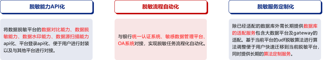 ■?通過(guò)與客戶4A平臺(tái)、數(shù)據(jù)資產(chǎn)管理平臺(tái)、OA平臺(tái)進(jìn)行對(duì)接整合,實(shí)現(xiàn)數(shù)據(jù)脫敏導(dǎo)數(shù)流程的線上化與自動(dòng)化,導(dǎo)數(shù)耗時(shí)縮短80%以上。