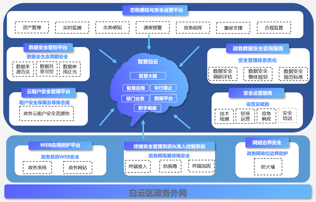 因此亟需開展“智慧白云”安全體系建設(shè)工作,需要統(tǒng)籌“智慧白云”各子系統(tǒng)架構(gòu)與數(shù)據(jù)的安全邊界,以“安全、合規(guī)、可控”為實現(xiàn)目標(biāo),從管理機制、技術(shù)保障、安全運營等角度去構(gòu)建立體化縱深防御體系,護(hù)航“智慧白云”體系和白云區(qū)政府?dāng)?shù)字化的健康發(fā)展。對此,安恒信息深度參與“智慧白云”安全體系建設(shè),共同筑牢白云區(qū)數(shù)字政府網(wǎng)絡(luò)安全防線。