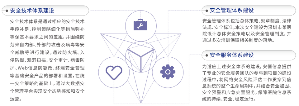 通過對安全技術體系,安全管理體系和安全運行體系建設,使深圳市某醫(yī)院的信息系統(tǒng)安全保障水平符合《信息安全等級保護建設指南》的要求,并通過等級保護測評