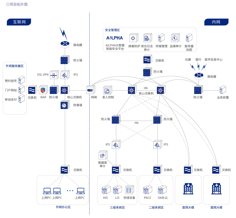 在此背景下, 深圳市某醫(yī)院按照深圳市衛(wèi)健委的工作部署,開展了等級保護安全保障體系建設工作,以提升信息系統(tǒng)安全防護水平,并滿足相關監(jiān)管要求。