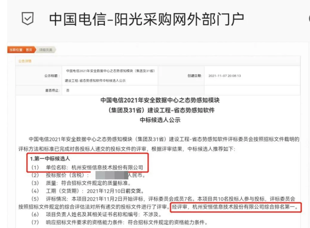 以綜合分第一的成績中標(biāo)中國電信態(tài)勢感知項目。