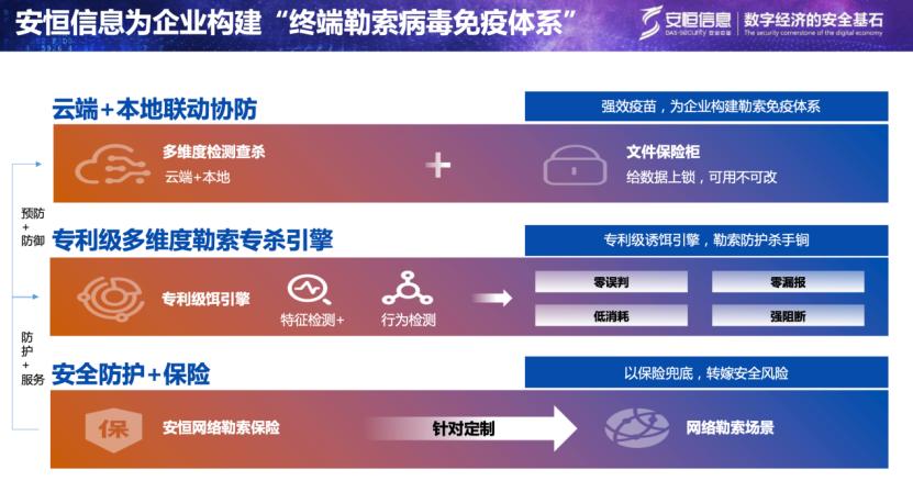 2021年4月安恒EDR推出“勒索病毒口罩&疫苗”創(chuàng)新解決方案以及防勒索U盤。該方案圍繞數(shù)據(jù)防勒索為目標(biāo),以資產(chǎn)為中心構(gòu)建了勒索風(fēng)險(xiǎn)處置閉環(huán),包括、監(jiān)測(cè)、預(yù)防、防御、響應(yīng)、溯源、加固6大階段,包含多項(xiàng)核心技術(shù)專利。“防勒索疫苗”方案一經(jīng)推出,立刻引發(fā)了行業(yè)震動(dòng),在勒索攻擊愈發(fā)猖狂的形勢(shì)下猶如給廣大的企事業(yè)客戶注射了一支強(qiáng)心劑。