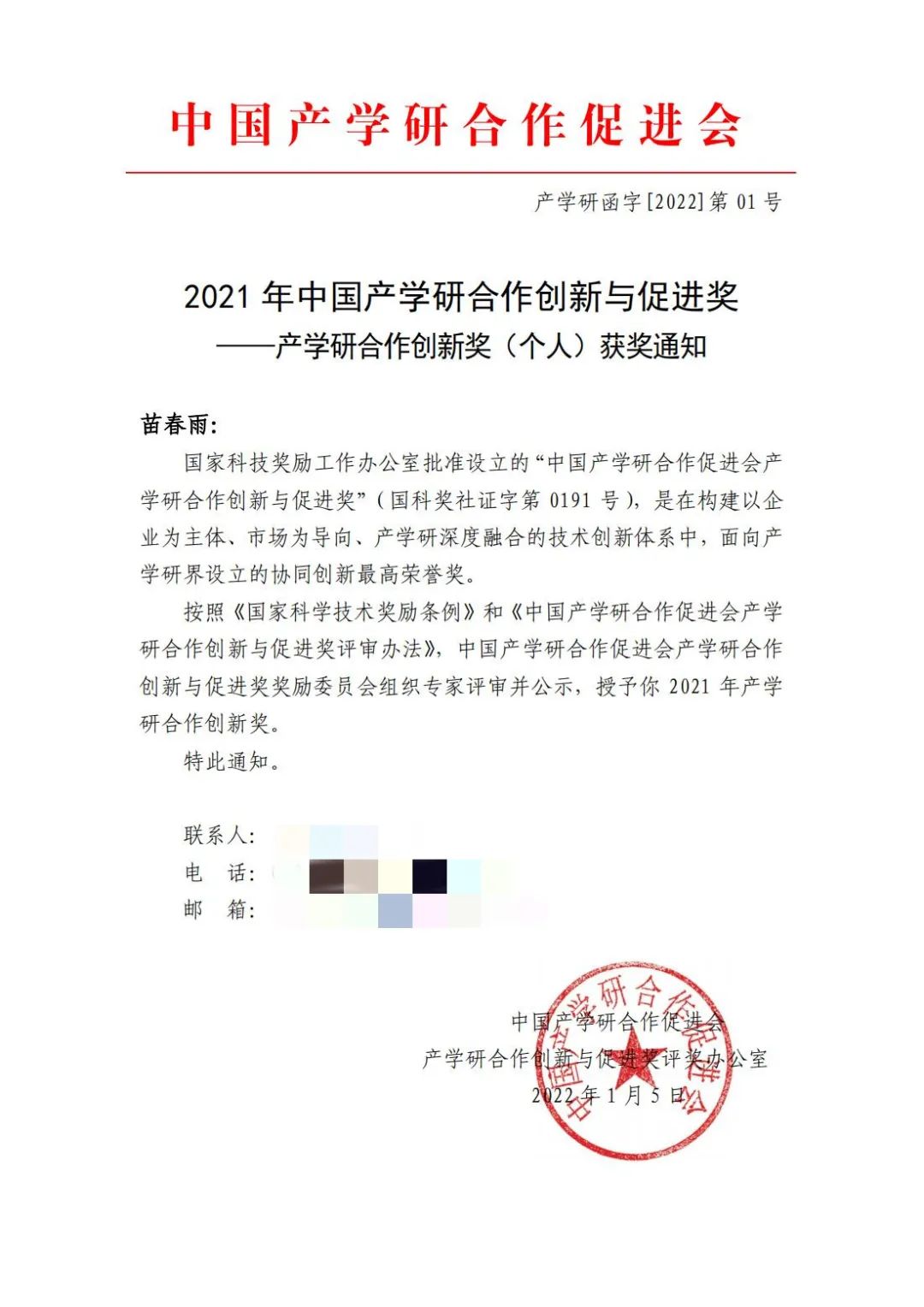 苗春雨榮獲產(chǎn)學(xué)研合作創(chuàng)新獎(jiǎng)
