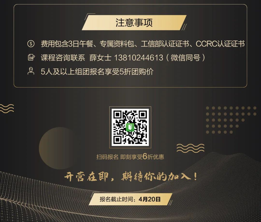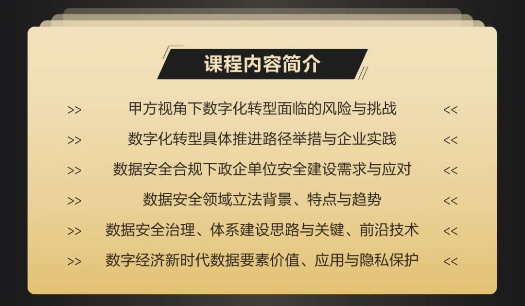 數(shù)字安全官高級研修班課程框架包括5大主題,10塊課程安排,培訓對象為黨政軍企網(wǎng)絡安全工作的主管領(lǐng)導或主要負責人,旨在提升他們的網(wǎng)絡安全建設戰(zhàn)略思路與實踐能力,限制30人。所有授課結(jié)束后將進行學員交流分享+講師點評并做評優(yōu)。此外,還會建立學員交流群,講師入群,隨時互動。