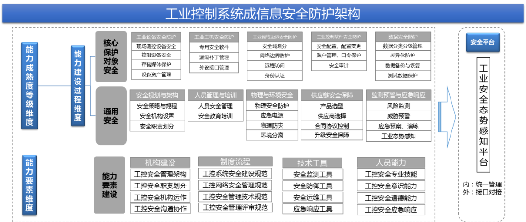 根據(jù)《工業(yè)控制系統(tǒng)信息安全防護(hù)指南》和《信息安全技術(shù)?工業(yè)控制系統(tǒng)信息安全防護(hù)能力成熟度模型(報(bào)批稿)》等政策標(biāo)準(zhǔn)中的防護(hù)要點(diǎn),安恒信息形成了以能力要素建設(shè)為基礎(chǔ),通用安全為保障,核心保護(hù)對(duì)象安全為核心,工業(yè)安全態(tài)勢(shì)感知平臺(tái)為抓手的安全防護(hù)架構(gòu)。本項(xiàng)目中,安恒信息按照《成熟度模型》三級(jí)要求協(xié)助大冶特殊鋼有限公司進(jìn)行安全建設(shè),并提出將工業(yè)控制系統(tǒng)信息安全防護(hù)能力建設(shè)提升到成熟度4級(jí)(綜合協(xié)同),并向5級(jí)(智能優(yōu)化)目標(biāo)邁進(jìn)的規(guī)劃建議。