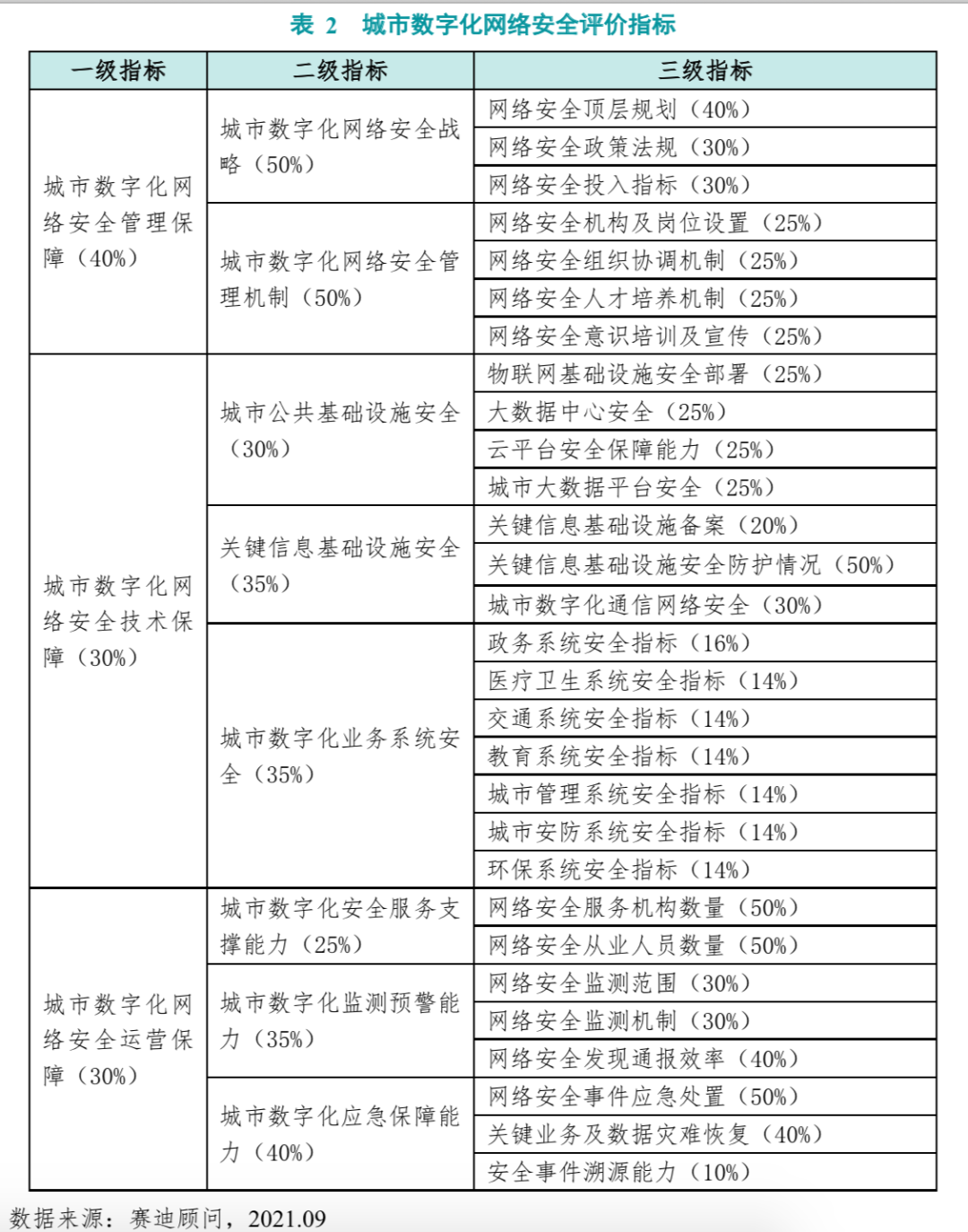 為探索城市數(shù)字化網(wǎng)絡(luò)安全建設(shè)特色,總結(jié)典型城市在數(shù)字化、智能化轉(zhuǎn)型升級過程中的網(wǎng)絡(luò)安全建設(shè)先進經(jīng)驗,白皮書圍繞城市數(shù)字化網(wǎng)絡(luò)安全管理保障、城市數(shù)字化網(wǎng)絡(luò)安全技術(shù)保障、城市數(shù)字化網(wǎng)絡(luò)安全運營保障3大方面形成城市數(shù)字化網(wǎng)絡(luò)安全評價指標體系。具體包括10個二級指標,40個三級指標,涵蓋城市數(shù)字化網(wǎng)絡(luò)安全頂層設(shè)計、管理機制、基礎(chǔ)設(shè)施安全、通信網(wǎng)絡(luò)安全、業(yè)務(wù)系統(tǒng)安全、數(shù)據(jù)安全、監(jiān)測預(yù)警與應(yīng)急保障等多方面內(nèi)容,以便全方位評價城市在數(shù)字化轉(zhuǎn)型過程中的網(wǎng)絡(luò)安全建設(shè)水平。