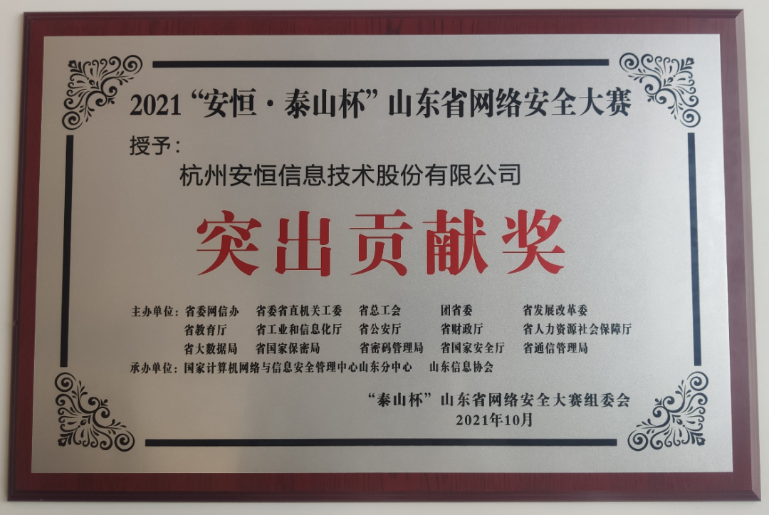 安恒信息作為獨家冠名和技術(shù)支持單位,一如既往的協(xié)助做好賽事的有關(guān)組織工作,竭盡全力、周密安排,高質(zhì)量、高水平地完成承擔(dān)的各項任務(wù),確保大賽各項活動順利進(jìn)行,獲得大賽組委會高度認(rèn)可,授予突出貢獻(xiàn)獎。