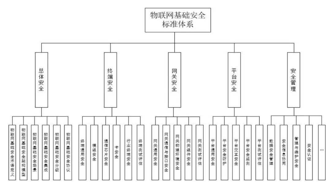《行動(dòng)計(jì)劃》提出,物聯(lián)網(wǎng)基礎(chǔ)安全標(biāo)準(zhǔn)主要是指物聯(lián)網(wǎng)終端、網(wǎng)關(guān)、平臺(tái) 等關(guān)鍵基礎(chǔ)環(huán)節(jié)的安全標(biāo)準(zhǔn)。物聯(lián)網(wǎng)基礎(chǔ)安全標(biāo)準(zhǔn)體系包括 總體安全、終端安全、網(wǎng)關(guān)安全、平臺(tái)安全、安全管理等 5 大類標(biāo)準(zhǔn)。