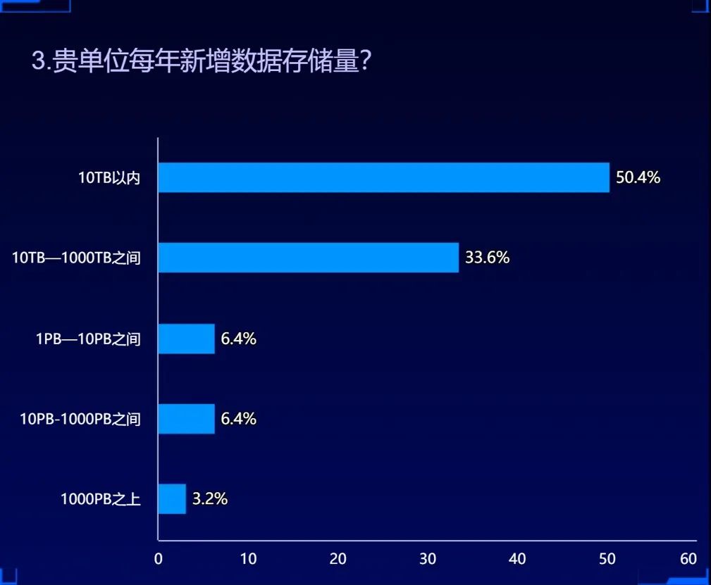 2、絕大多數(shù)客戶單位的年數(shù)據(jù)增量保持1000TB以內(nèi)的量級(jí),這個(gè)速度結(jié)合受訪客戶單位的規(guī)模、行業(yè)具備一定的參考意義和分析價(jià)值;
