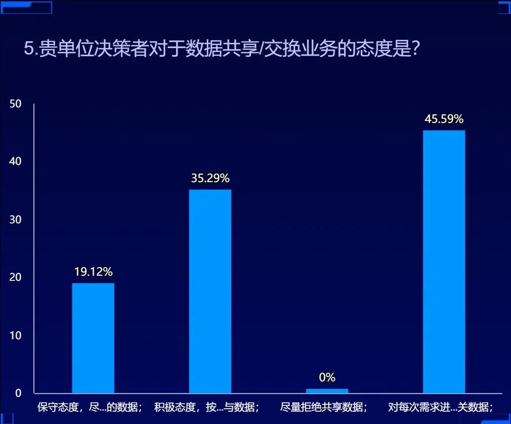 54.4%的客戶表示單位有數(shù)據(jù)共享/交換業(yè)務(wù),27.2%的客戶表示短期內(nèi)沒(méi)有相關(guān)業(yè)務(wù),但后續(xù)會(huì)有需求。與此同時(shí),35.29%的單位決策者對(duì)數(shù)據(jù)共享/交換業(yè)務(wù)持積極態(tài)度,按照對(duì)方要求給與數(shù)據(jù)。19.12%的單位決策者持保守態(tài)度,盡可能給與少的數(shù)據(jù)。45.59%的單位決策者將從自身安全角度出發(fā)給與其相關(guān)數(shù)據(jù)。