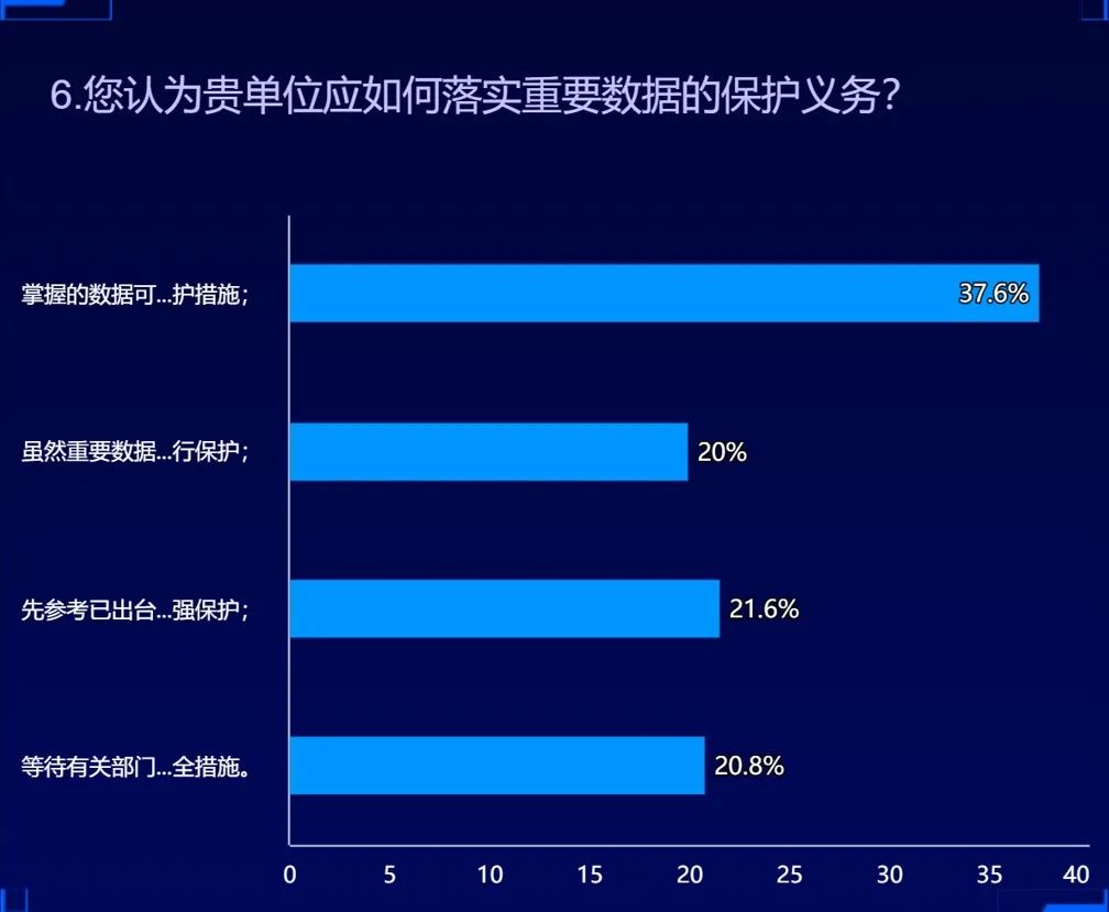 37.6%的客戶認(rèn)為掌握的數(shù)據(jù)可能已經(jīng)在重要數(shù)據(jù)范圍內(nèi),將采取更嚴(yán)格的保護(hù)措施;21.6%的客戶表示先參考已出臺(tái)的重要數(shù)據(jù)識(shí)別的相關(guān)規(guī)則自行識(shí)別,報(bào)有關(guān)部門批準(zhǔn)后加強(qiáng)保護(hù)。