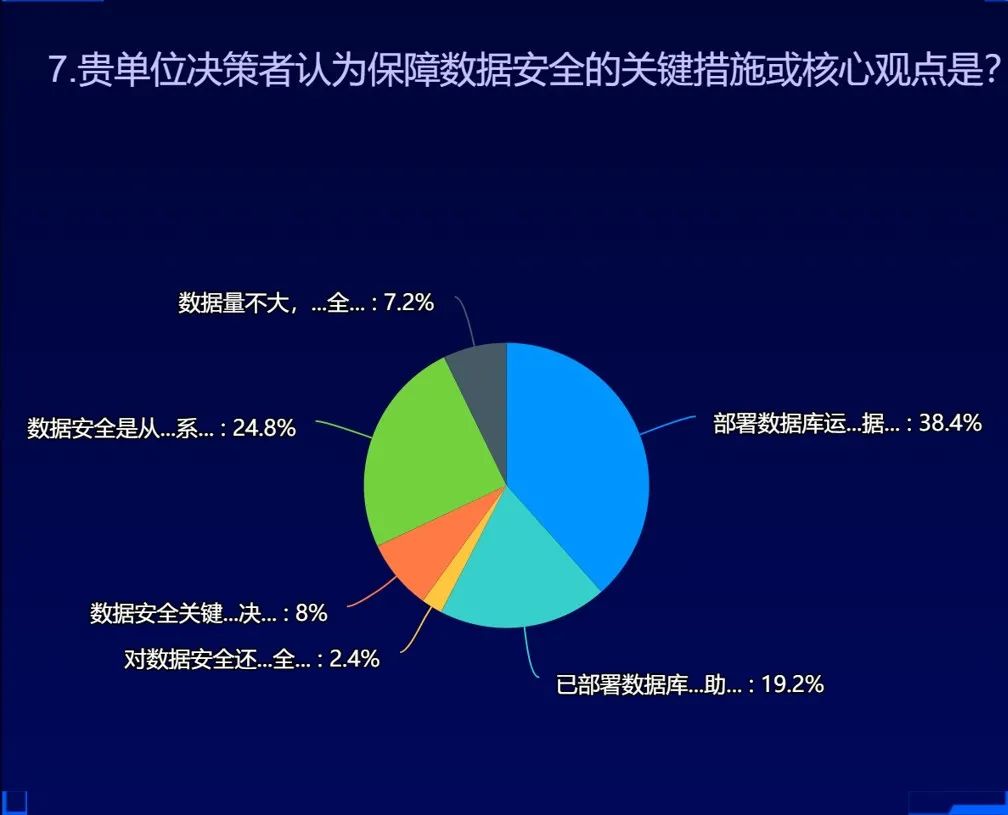38.4%的單位決策者認(rèn)為部署數(shù)據(jù)庫(kù)運(yùn)維審計(jì)、DLP、文檔加密、防火墻等產(chǎn)品,足夠保障數(shù)據(jù)安全。24.8%的單位決策者表示數(shù)據(jù)安全是從全局規(guī)劃、產(chǎn)品設(shè)置、平臺(tái)建設(shè)、持續(xù)運(yùn)營(yíng)等多維度保障的體系,目前正在準(zhǔn)備推進(jìn)體系建設(shè)。19.2%的單位決策者表示已部署數(shù)據(jù)庫(kù)運(yùn)維審計(jì)等安全產(chǎn)品,但還需要運(yùn)維人員協(xié)助運(yùn)營(yíng)。