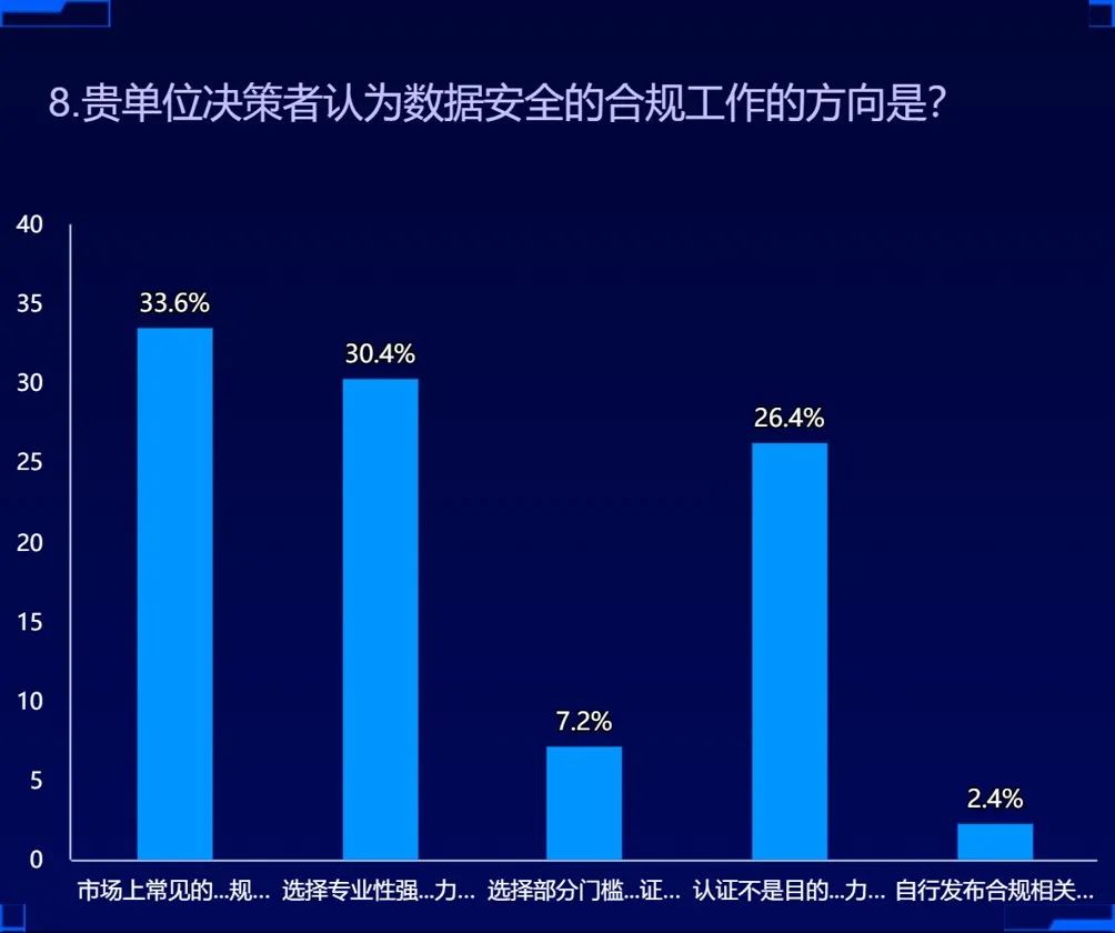 33.6%的單位決策者認(rèn)為市場(chǎng)上常見(jiàn)的認(rèn)證都要盡快拿到,證明自身合規(guī)水平。而30.4%的單位決策者認(rèn)為選擇專業(yè)性強(qiáng)、門檻高的少量認(rèn)證證明能力即可。