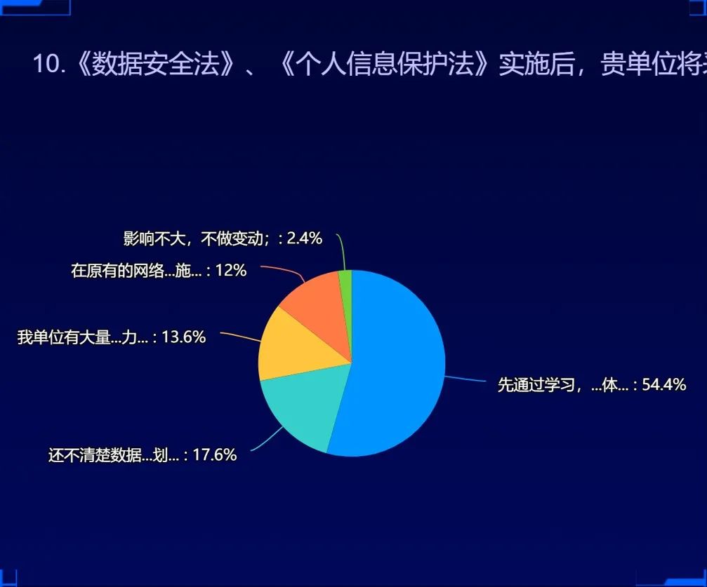只有2.4%的客戶表示,《數(shù)據(jù)安全法》、《個(gè)人信息保護(hù)法》實(shí)施后對(duì)單位影響不大。過(guò)半數(shù)客戶表示會(huì)先通過(guò)學(xué)習(xí),弄清楚法律法規(guī)具體要求。