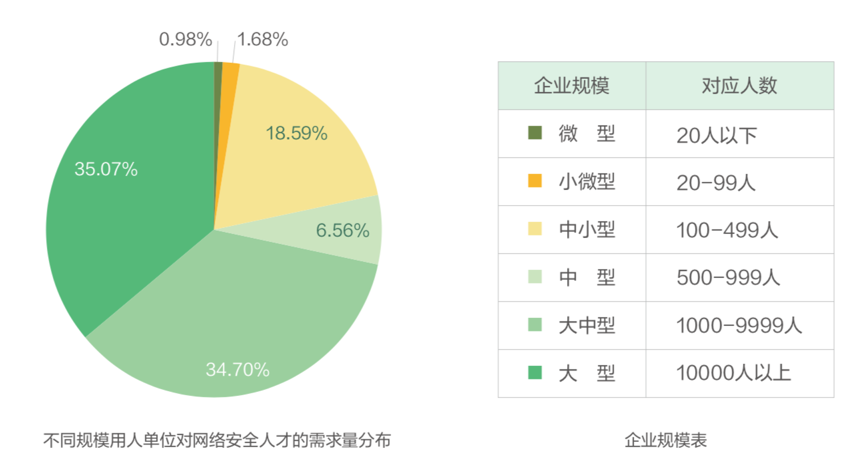 從用人單位規(guī)模維度出發(fā),萬(wàn)人規(guī)模以上大型企業(yè)對(duì)于網(wǎng)安類人才需求最高,為35.70%。值得注意的是,百人規(guī)模以上的中型企業(yè)和中小型企業(yè),對(duì)于網(wǎng)絡(luò)安全人才的需求,近三年來(lái)以每年接近3個(gè)百分點(diǎn)的增幅在不斷提高,表明自2019年網(wǎng)絡(luò)安全等級(jí)保護(hù)制度2.0標(biāo)準(zhǔn)正式發(fā)布后提高了對(duì)中小型機(jī)構(gòu)的安全等級(jí),中小企業(yè)、民營(yíng)企業(yè)——經(jīng)濟(jì)社會(huì)中數(shù)量最多的主體的安全需求正在逐步提升。
