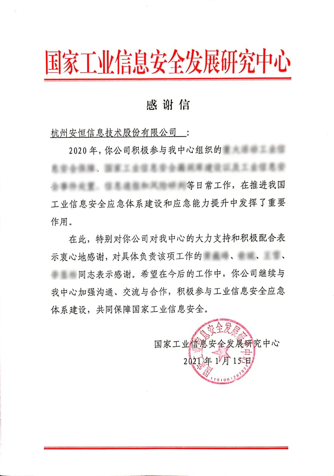 榮耀二連!安恒信息連續兩年收到「國家工業信息安全發展研究中心」感謝信