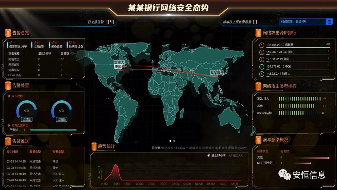 同時安恒信息AiLPHA大數(shù)據(jù)智能安全平臺幫助金融行業(yè)構(gòu)建一套安全運營視角劃分清晰、協(xié)同響應(yīng)完善的智能安全運營平臺。平臺能夠通過大屏多維度感知上報事件態(tài)勢,顯示攻擊線路與網(wǎng)絡(luò)攻擊、惡意郵件、病毒等及各類事件的處置情況;同時,還能夠分析占比高的攻擊類型、病毒類型等,實時了解網(wǎng)絡(luò)安全態(tài)勢、實現(xiàn)大數(shù)據(jù)以及SOAR安全運營編排調(diào)度能力,通過安全響應(yīng)流程編排,可實現(xiàn)自動化分析研判、處置聯(lián)動、通報預(yù)警,極大降低安全事件的處置時間,增強運營效率。