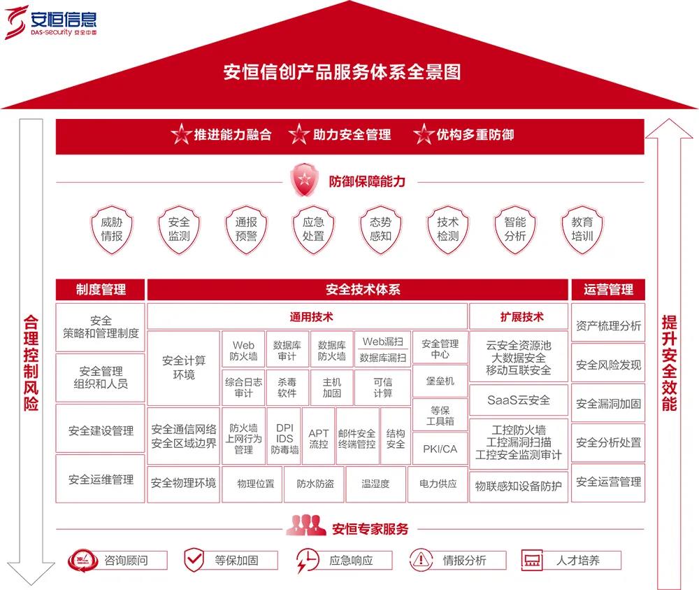 在已有信創(chuàng)產(chǎn)品和規(guī)劃基礎(chǔ)上,安恒信息推出信創(chuàng)整體解決方案。除基礎(chǔ)安全產(chǎn)品外,在云計算、大數(shù)據(jù)和態(tài)勢感知的安全領(lǐng)域都進行了深入研究并形成產(chǎn)品,配合安恒專家服務(wù)有效完善管理制度、運維制度推進與客戶能力融合;同時通過威脅情報、通報預(yù)警、智能分析等防御保障能力,優(yōu)構(gòu)多重防御合理控制風(fēng)險,提升安全效能,協(xié)助用戶建設(shè)全面的安全體系。
