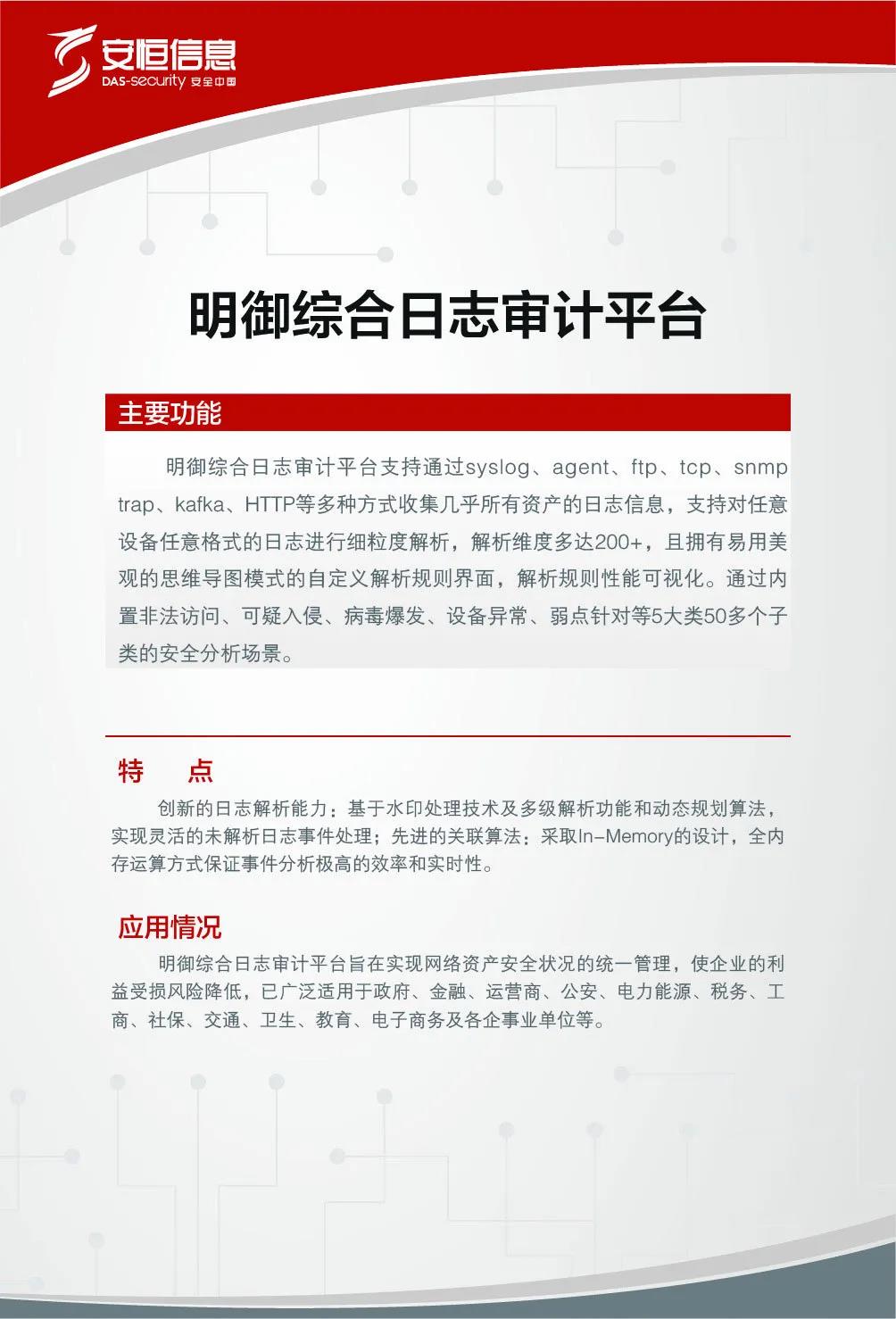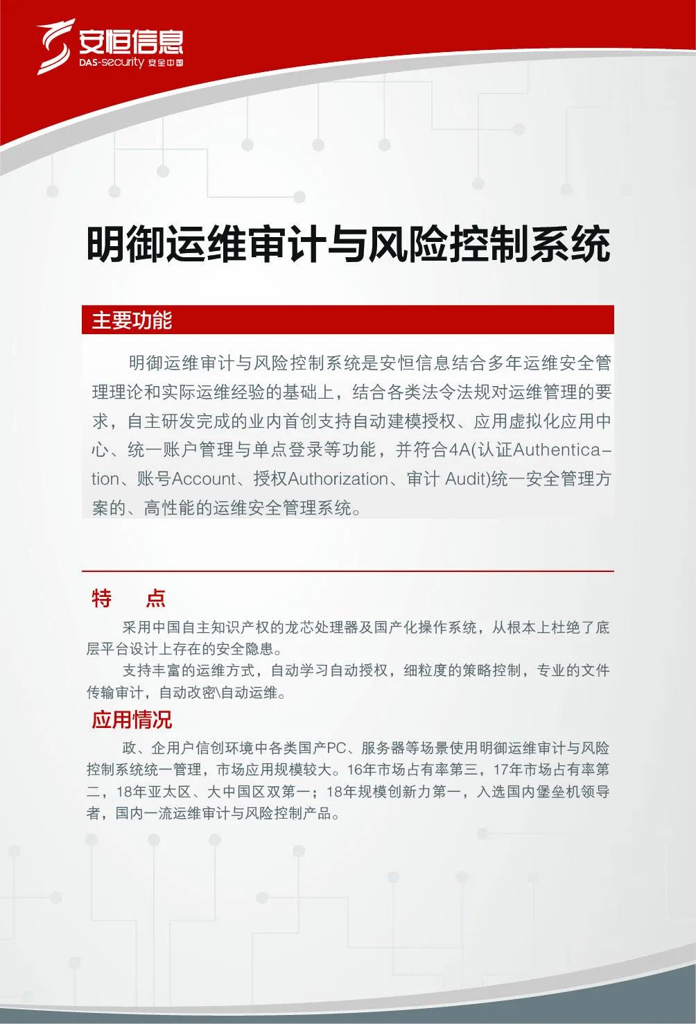 安恒信息高度重視信息技術(shù)應(yīng)用創(chuàng)新的實踐,2015年即已開展國產(chǎn)化硬件適配工作,并且已在部分客戶中成功測試及應(yīng)用。2019年12月24日龍芯中科“新時代芯生態(tài)”2019產(chǎn)品發(fā)布暨用戶大會在北京舉辦,作為龍芯中科重要的產(chǎn)業(yè)化合作伙伴,安恒信息發(fā)布了基于龍芯3A4000/3B4000及國產(chǎn)操作系統(tǒng)架構(gòu)的兩款安全產(chǎn)品。