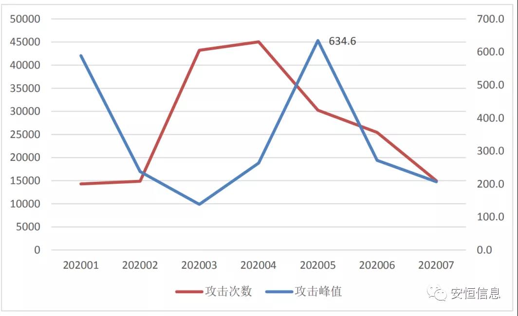 從上半年各月來(lái)看,云端攻擊源數(shù)量逐月上升,從攻擊次數(shù)來(lái)看,3/4月份為云端DDoS攻擊高峰,從攻擊峰值來(lái)看,5月峰值最高為634.6Gbps。