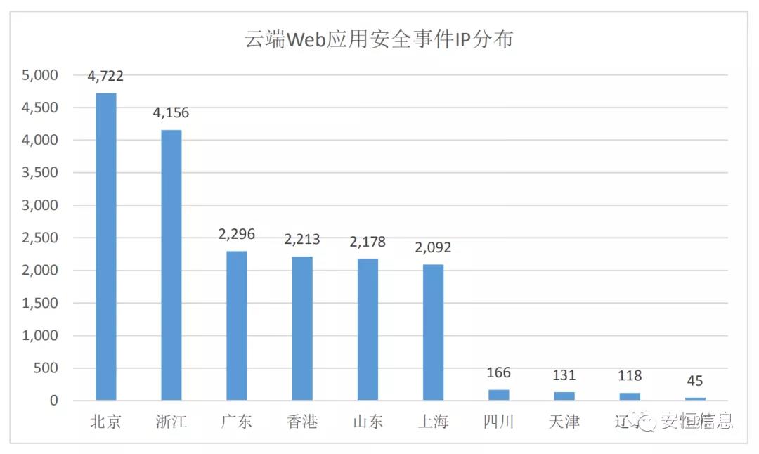 根據(jù)對(duì)存在安全事件的云端Web應(yīng)用IP所在區(qū)域進(jìn)行分析,發(fā)現(xiàn)主要分布在北京、浙江、廣東等區(qū)域。