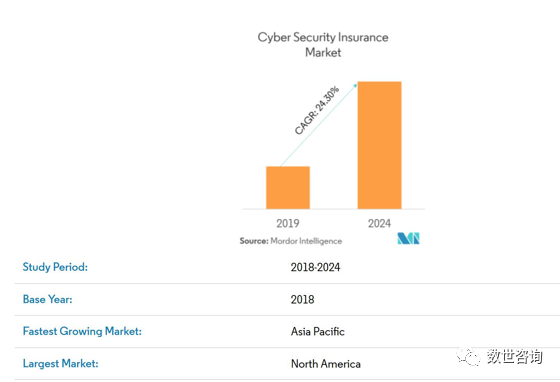?由于遭遇網絡攻擊的不可避免性,網絡安全保險業(yè)務開始明顯提升。據Mordor Intelligence統(tǒng)計,2018年網絡安全保險市場規(guī)模達到54.8億美元,并在5年內保持24.3%的復合增長率,于2024年達到207.2億美元的市場規(guī)模。