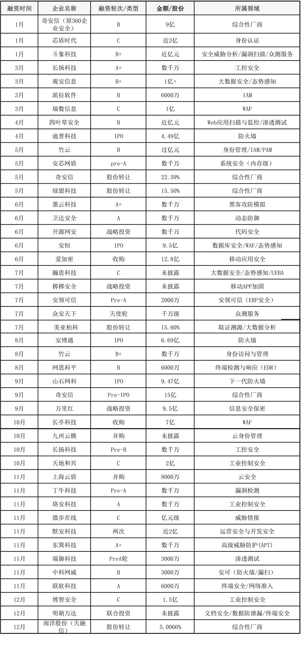 ?2019年國內融資并購總金額達108.3億人民幣,創(chuàng)歷史之最。其中,4家企業(yè)IPO(安恒信息、山石網科、安博通、迪普科技)30.15億元。收并購金額23.60億元,投融資金額54.55億元。