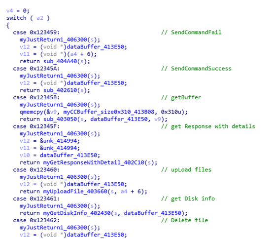 C2指令中包含非常多的基礎(chǔ)功能,包括文件獲取、磁盤遍歷、寫文件、重啟刪除、進(jìn)程創(chuàng)建、CMD命令執(zhí)行等,通過組合方式構(gòu)造成高級(jí)指令執(zhí)行。
