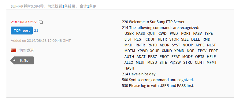 另一基礎(chǔ)設(shè)施IP:218.103.37.229在2019年8月28日開放過FTP端口: