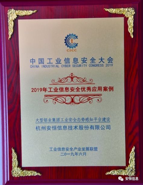最終,安恒信息的“大型鋁業(yè)集團(tuán)工業(yè)安全態(tài)勢(shì)感知平臺(tái)建設(shè)”榮獲“2019年工業(yè)信息安全優(yōu)秀應(yīng)用案例”。