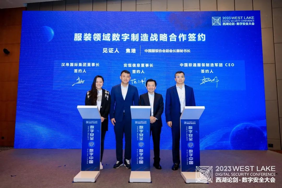 近日,在中國服裝協(xié)會副會長兼秘書長焦培見證下,漢帛國際集團(tuán)總裁高敏、安恒信息董事長范淵、中國聯(lián)通服裝制造軍團(tuán)CEO樊偉簽署合作協(xié)議。未來多方將攜手在服裝行業(yè)數(shù)字化轉(zhuǎn)型的安全建設(shè)等方面開展深入的合作,打造服裝產(chǎn)業(yè)數(shù)字化轉(zhuǎn)型中的網(wǎng)絡(luò)和數(shù)據(jù)安全建設(shè)樣板,用創(chuàng)新技術(shù)以及前沿戰(zhàn)略為行業(yè)高質(zhì)量發(fā)展保駕護(hù)航。