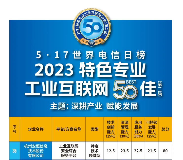 再獲認(rèn)可!安恒信息入圍2023特色專業(yè)工業(yè)互聯(lián)網(wǎng)50佳