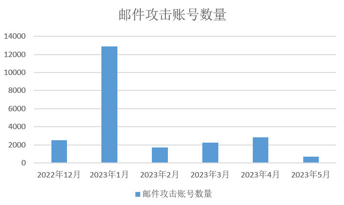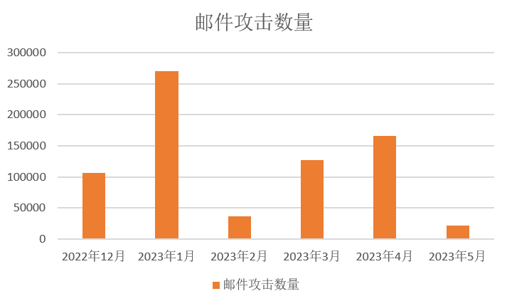 2022年12月至2023年5月期間,安恒信息云監(jiān)測平臺監(jiān)測到郵件攻擊超60萬次,這部分的攻擊是繞過了郵件安全網(wǎng)關(guān)并最終到達(dá)用戶郵件文件夾的郵件數(shù)量,即最終受影響的數(shù)量。