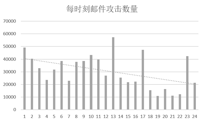 從攻擊時刻上分析,一天24小時基本上均有攻擊郵件到達(dá),可以判定攻擊者多采用自動化的攻擊手段,但是國內(nèi)用戶相對在1點~17點期間收到的惡意郵件更多,如圖2所示。