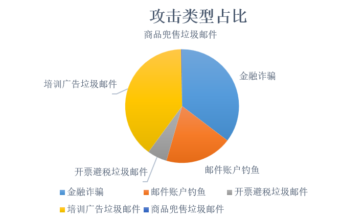 從惡意郵件類型分析,培訓(xùn)類廣告投遞和金融詐騙為主,分別占比39%和35%,其次是盜號釣魚類,占比19%,所以可以得出結(jié)論,惡意郵件攻擊以牟利為主要目的,如圖4所示。