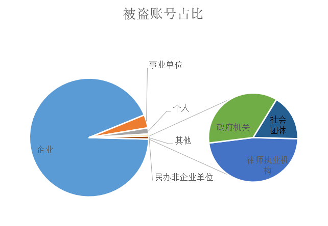 不法分子郵件攻擊賬號的來源可能自己搭建節(jié)點,也可能是通過盜號的方式獲取的原本正常的賬號。選取其中可以識別到單位的攻擊賬號,可以清楚的發(fā)現(xiàn)企業(yè)是賬號被盜的重災(zāi)區(qū),被盜賬號占比高達(dá)93.4%,其次部分的事業(yè)單位也存在對應(yīng)的風(fēng)險,約占整體被盜賬號的3.6%,再就是個人的郵箱賬號占比1.7%,如圖5所示。