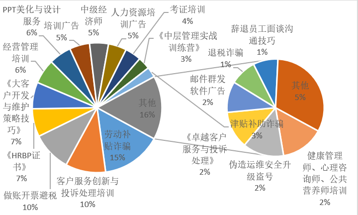 攻擊者以牟利為主要的目的,通常會實施培訓(xùn)廣告和金融詐騙兩種類型的郵件攻擊。針對郵件的主題進(jìn)行分析后,發(fā)現(xiàn)《關(guān)于發(fā)放員工補(bǔ)助(補(bǔ)貼)福利通知》、《個人勞動(補(bǔ)貼))已下發(fā),請查看下圖查收》這類勞動補(bǔ)貼類的詐騙郵件占比高達(dá)15%,其次是各類培訓(xùn),以企業(yè)經(jīng)營管理類培訓(xùn)為主,包含客服類、經(jīng)營管理類、人力資源、銷售類、 財務(wù)避稅等針對企業(yè)的各類培訓(xùn),整體高達(dá)40%,也有PPT美化,中級經(jīng)濟(jì)師等各類針對個人的培訓(xùn)約占20%。同時也會有開票避稅這類黑灰色產(chǎn)業(yè)信息,也有直接賣郵件群發(fā)軟件這類工具的郵件,如圖7所示。