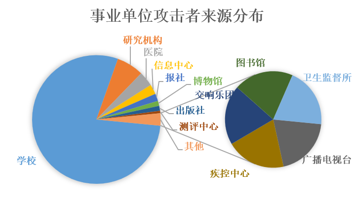 通過上文的分析,事業(yè)單位的問題賬號占比業(yè)相對較高,我們對這類攻擊者做了分析分類,發(fā)現(xiàn)其中絕大部分的攻擊賬號來源是學(xué)校,占比78%,涉及54所學(xué)校,通常情況下,學(xué)校的人員數(shù)多,賬號基數(shù)大,發(fā)生風(fēng)險的概率業(yè)相對較高,如圖9所示。