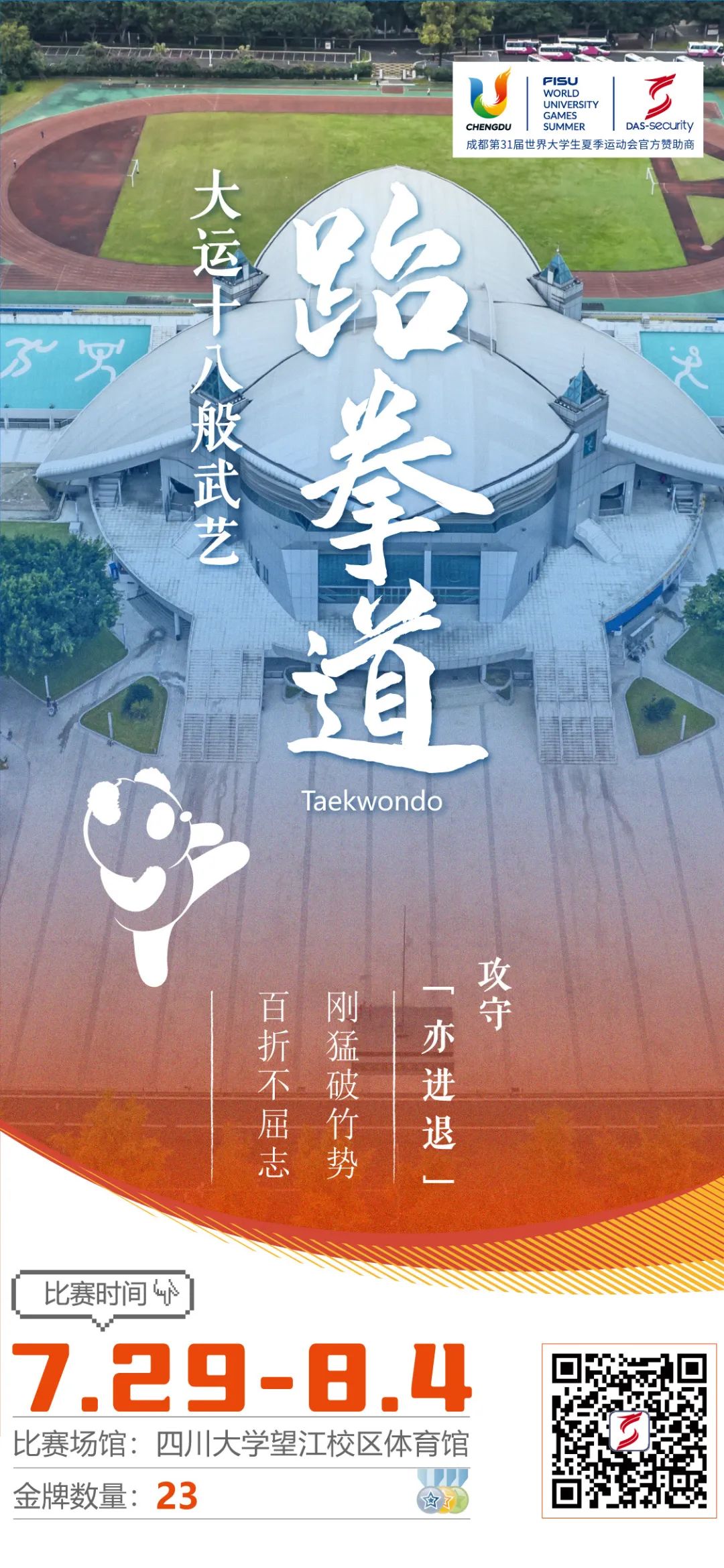 跆拳道起源于朝鮮半島,距今已有兩千多年的歷史,經(jīng)過東亞文化的發(fā)展,以“始于禮,終于禮”的武道精神為基礎(chǔ)。本屆大運會中跆拳道賽事將持續(xù)7天,包括競技賽、品勢賽兩大類別,共計產(chǎn)生23枚金牌。