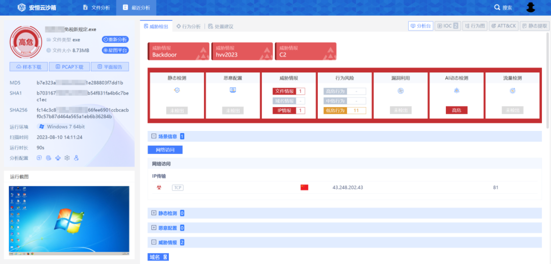 安恒云沙箱有助于快速分析釣魚相關(guān)樣本,方便分析人員迅速定位關(guān)鍵信息,掌握樣本回連地址等分析人員最關(guān)心的惡意樣本核心內(nèi)容,幫助分析人員分析出IP/域名/端口/URL,實(shí)現(xiàn)快速封禁。