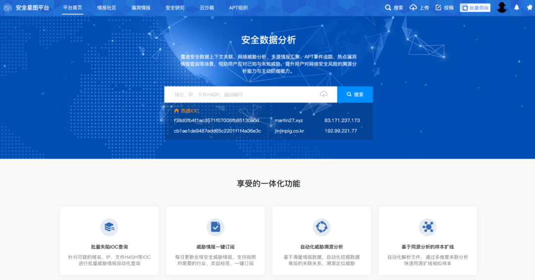 安全星圖平臺(tái),助力安全運(yùn)維人員第一時(shí)間獲知IOC準(zhǔn)確詳情,在釣魚比賽中搶占先機(jī)!平臺(tái)還支持批量IOC查詢,針對(duì)大量IOC分析需求,提供強(qiáng)力支撐。