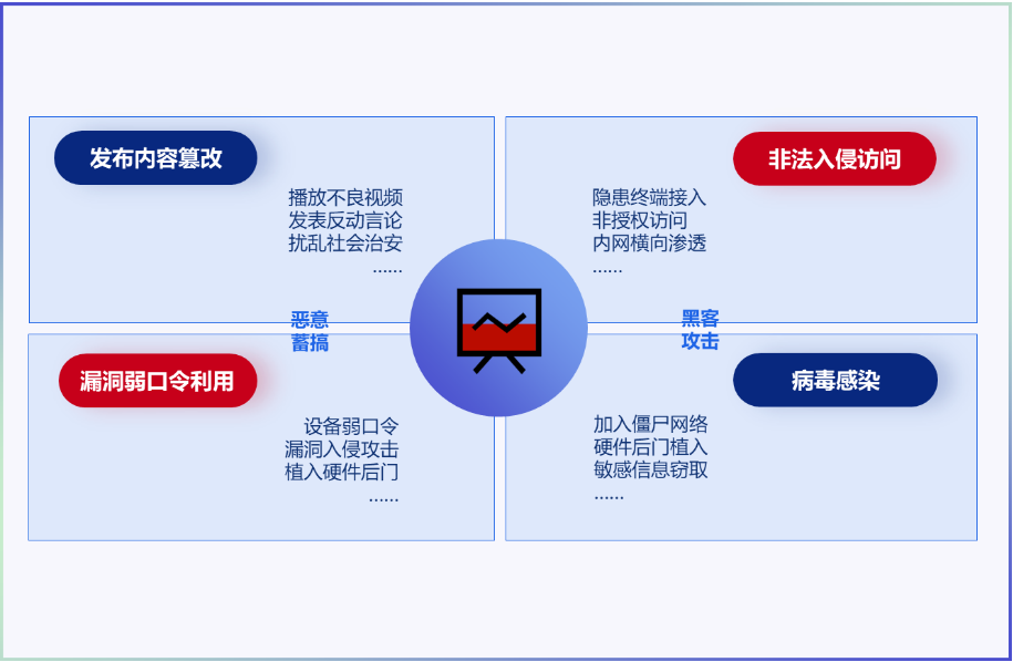 ◆?大屏設備被拆、剪或用非法設備偽裝接入內(nèi)網(wǎng),無法及時感知發(fā)現(xiàn)