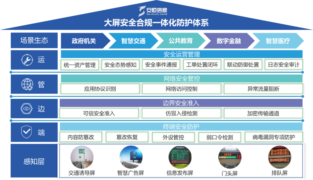 ◆ 安全運營管理:統(tǒng)一資產(chǎn)管理、安全態(tài)勢感知、安全事件通報、工單閉環(huán)處置、聯(lián)動防御控制、日志安全審計的安全防護能力,梳理清楚資產(chǎn)底數(shù),堅持“誰建設誰負責,誰使用誰負責,誰受益誰負責,誰維護誰負責”的原則,嚴格落實網(wǎng)絡安全主體責任,利用技術手段確保大屏安全穩(wěn)定運行。