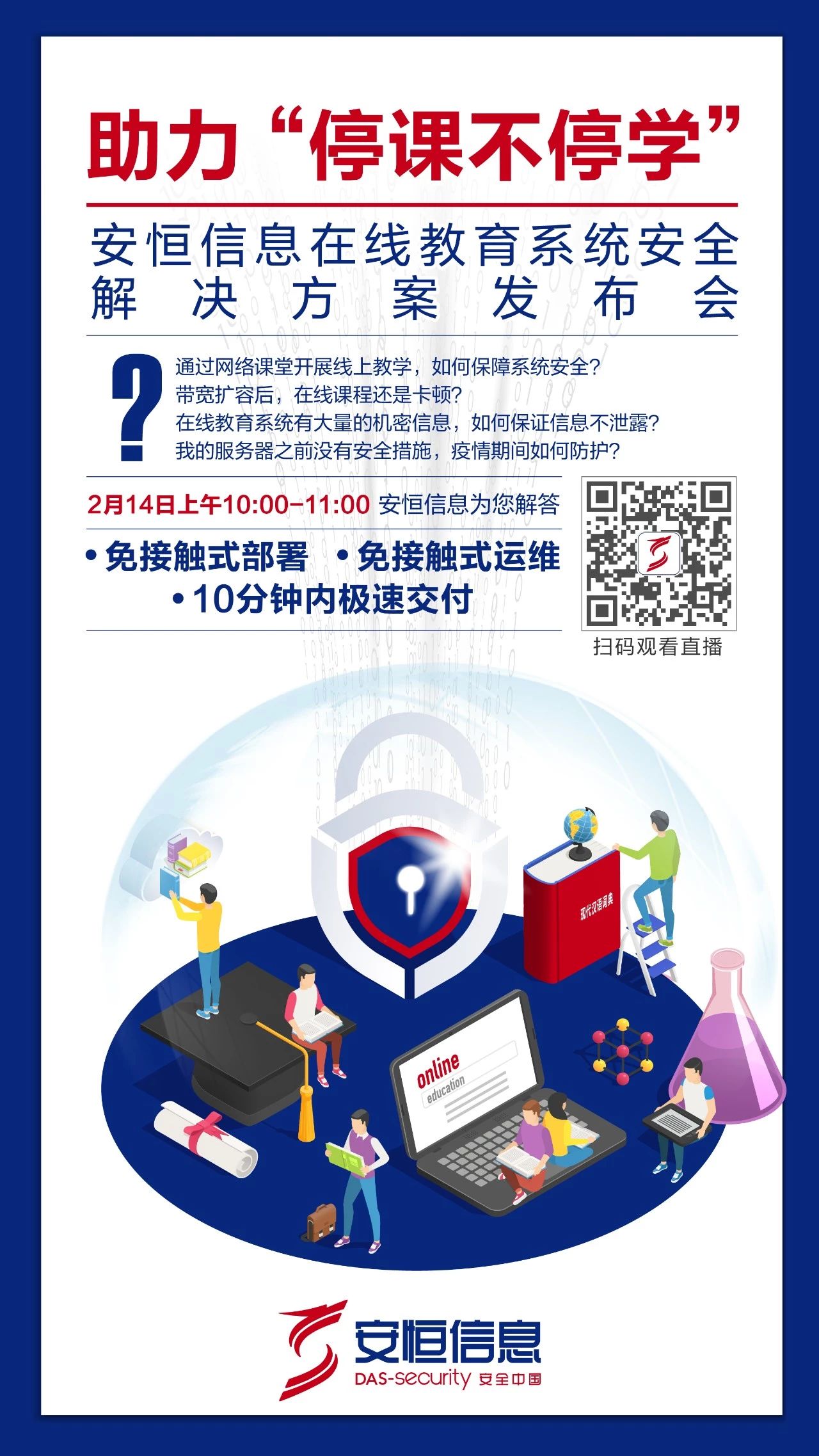 安恒信息基于教育機(jī)構(gòu)的網(wǎng)絡(luò)特性和行業(yè)沉淀,推出一體化的在線教育系統(tǒng)安全解決方案。由于疫情特殊時期,免接觸、交付快、響應(yīng)快的saas化安全解決方案成為當(dāng)前的不二選擇。