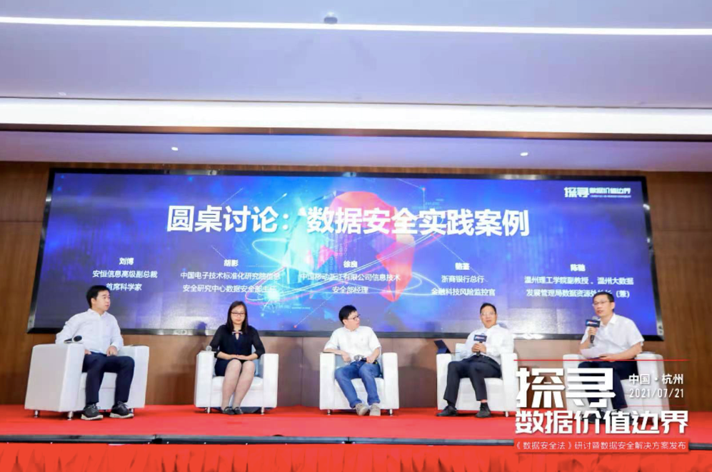 ▲ 從左到右依次為:安恒信息高級副總裁、首席科學(xué)家劉博;中國電子技術(shù)標準化研究院網(wǎng)絡(luò)安全研究中心數(shù)據(jù)安全部主任胡影;浙江移動信息技術(shù)部安全室經(jīng)理徐良;浙商銀行總行金融科技風(fēng)險監(jiān)控官駱鑒;溫州理工學(xué)院副教授、溫州大數(shù)據(jù)發(fā)展管理局數(shù)據(jù)資源處處長(兼)
