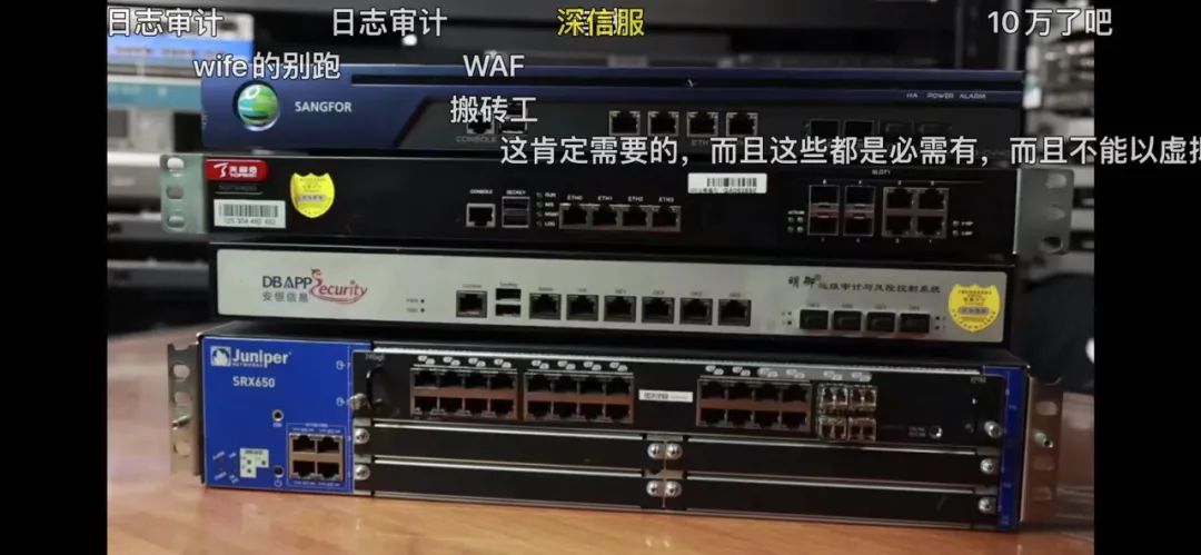 這個等保一體機是在技術層面上具備過等保2.0的安全設備。也就是說,原則上二級跟三級等保的過測只用它就可以。從等保2.0安全合規(guī)上,這臺設備相當于我們這里全部的安全設備。(對,up主在視頻里展示了一摞機器,足足有十臺之多)