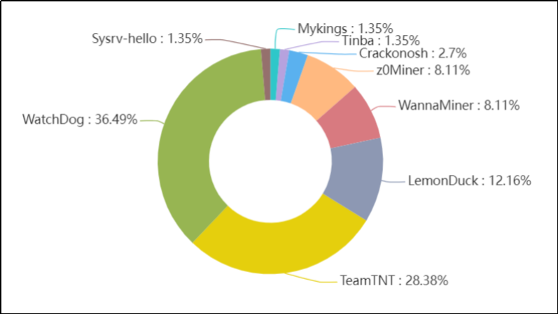 據安恒威脅情報中心監(jiān)測數(shù)據顯示,2021年國內外挖礦木馬家族總量做多的是WatchDog家族,占總量的36.9%,其次是TeamTNT家族,占總量的28.38%,然后是LemonDuck家族,占總量的12.16%。